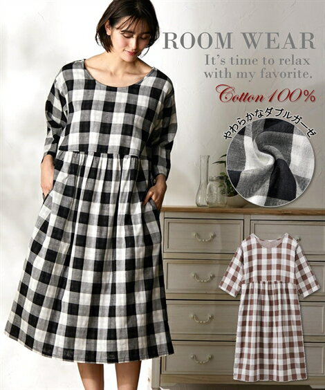 パジャマ トップス 大きいサイズ レディース 綿100% ダブルガーゼ 大きめ チェック 7分袖 ゆったり ルーム ワンピース ブラウン系/黒系 8L/10L ニッセン nissen